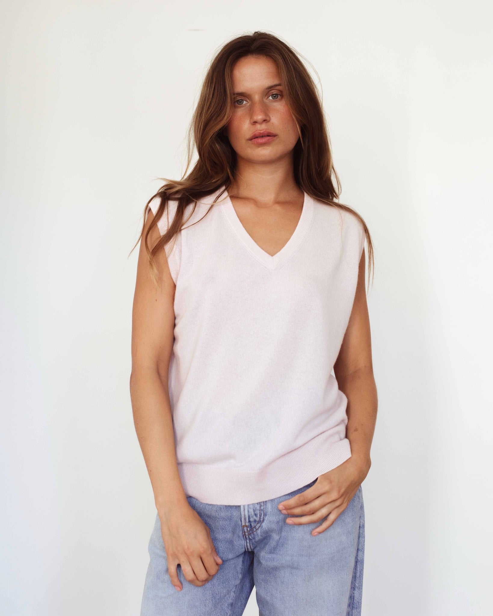 A soft cashmere débardeur with a clean V-neck and relaxed fit. Lightweight, timeless and easy to style — perfect on its own or layered throughout the seasons.