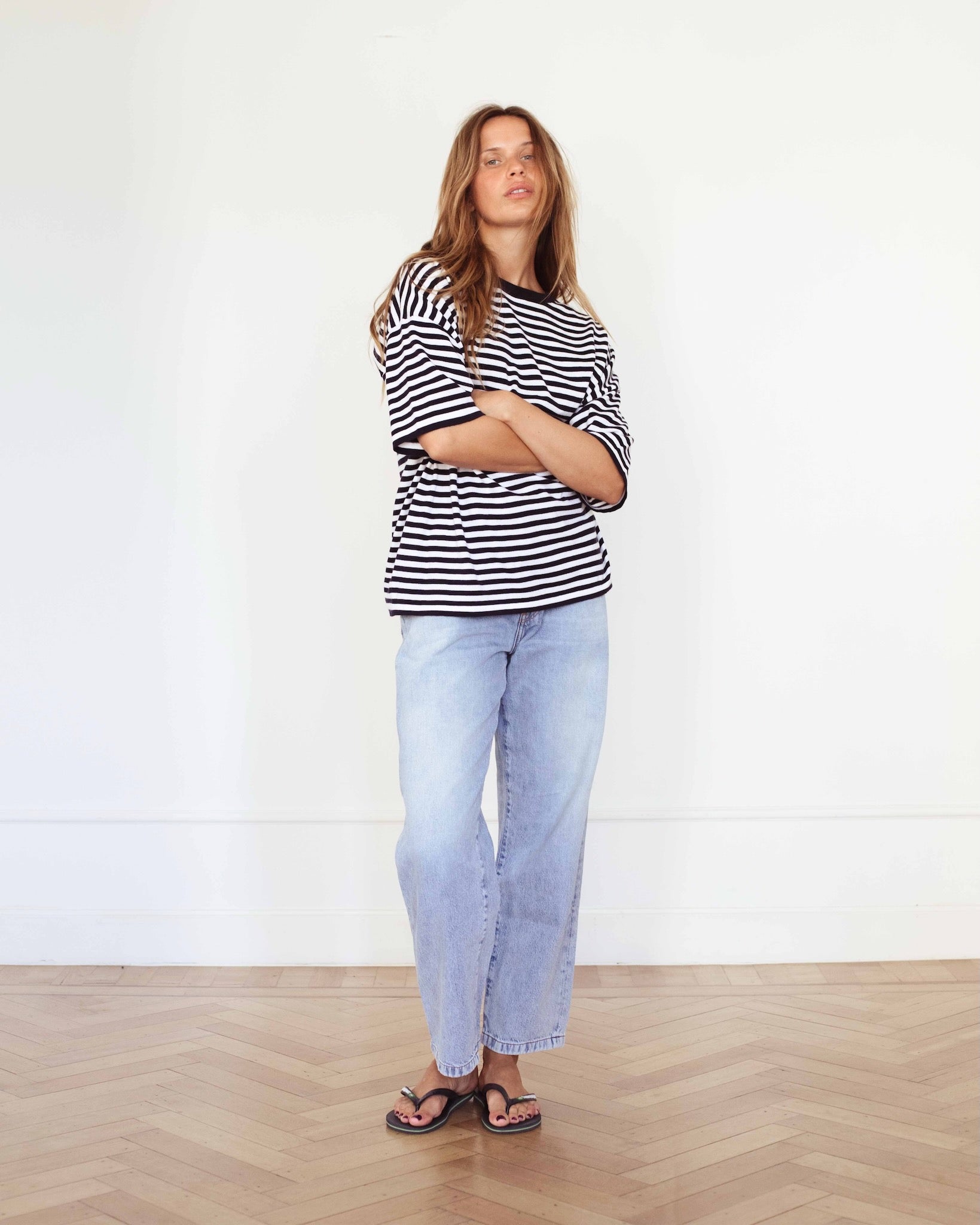 A soft cotton–cashmere T-shirt with a relaxed, easy silhouette. Lightweight, breathable and gentle on the skin, it’s the perfect everyday essential. The refined stripe and timeless shape make it effortless to style season after season.